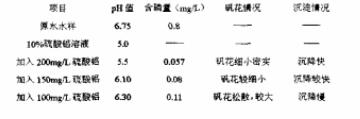 取三個(gè)1000mL燒杯,分別加入1000ml經(jīng)生化處理后的生活污水,測(cè)定原水pH值及含磷量。配置10%硫酸鋁除磷劑,并測(cè)定其pH。將硫酸鋁按投加量為200mg/L、150mg/L、100mg/L分別加入試驗(yàn)水樣中,攪拌混合,靜置沉淀后,首先確定加除磷劑后污水的pH值,觀察礬花生成和沉淀情況.取上清液,測(cè)出磷酸鹽的含量。