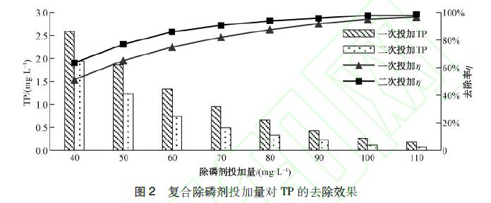 混凝過(guò)程中觀察絮體生成及絮體沉降情況可以看出,二次投加時(shí)生成絮體更加密實(shí),且沉降速度更快。分析原因?yàn)?次投加除磷劑后,在急速攪拌的情況下,會(huì)生成大量微小絮體,二次投加后,除磷劑顆粒與已經(jīng)形成的微小絮體結(jié)合,生成更密實(shí)、沉降速度更快的絮體。