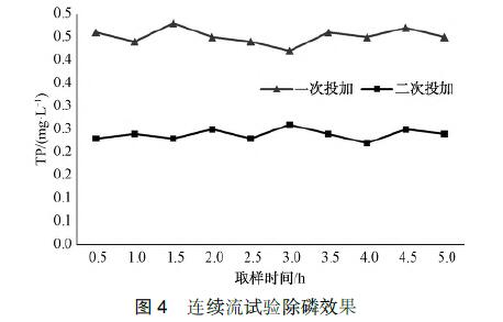 連續(xù)流試驗(yàn)時(shí)采用如圖3所示流程,選擇污水除磷劑投加量為90mg/L,討論一次投加與二次投加方式的除磷效果。一.次投加時(shí),在混合池中一次性投加除磷劑;二次投加時(shí),次投加在混合池,第二次投加在反應(yīng)池?;旌铣?cái)嚢杷俣燃s為300r/min,在混合池反應(yīng)30~40s后進(jìn)入反應(yīng)池,反應(yīng)池?cái)嚢杷俣葹?50 r/min,反應(yīng)約5min后,進(jìn)入沉淀池,經(jīng)20~25min流至出水口。每30min取出水進(jìn)行指標(biāo)檢測(cè),磷去除效果如圖4所示。試驗(yàn)發(fā)現(xiàn),初始TP為5mg/L,二次投加除磷劑時(shí),出水TP可以穩(wěn)定達(dá)到地表水IV類(lèi)標(biāo)準(zhǔn),且出水TP明顯低于一次投加,這與靜態(tài)試驗(yàn)結(jié)果相符。二次投加時(shí)磷去除率比一次投加增加了約4%,因此選擇二次投加除磷劑的方式是可行的,實(shí)際工程中可選擇使用兩組計(jì)量泵恒量投加除磷劑的方式。投加除磷劑后,出水濁度從2.63NTU降低至0.99NTU,去除率達(dá)到了62.4%,但是對(duì)水中COD卻無(wú)明顯去除效果,分析原因?yàn)樾@的水中COD為溶解性COD,通過(guò)化學(xué)混凝的方法對(duì)其無(wú)去除作用。
